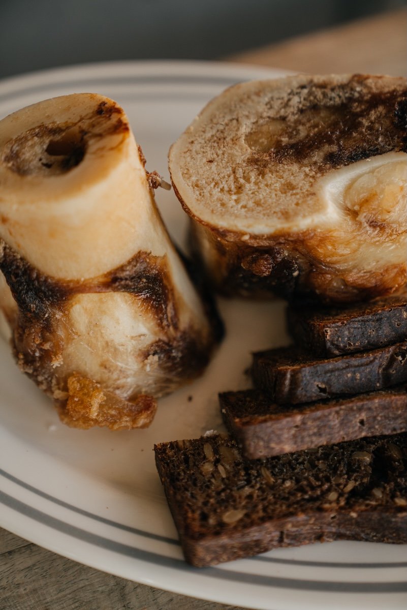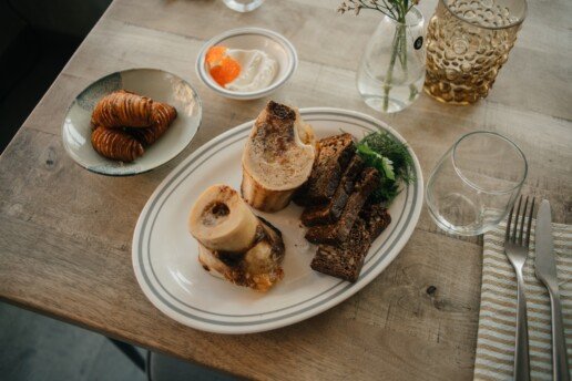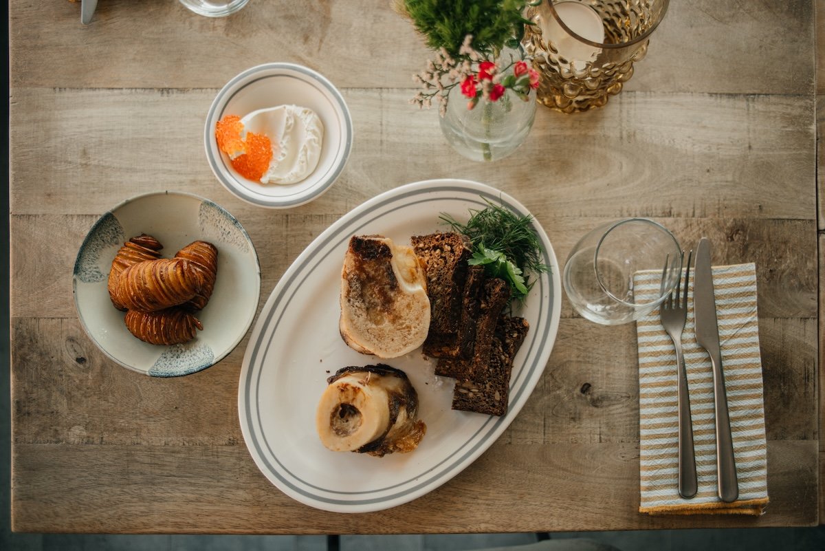 Užkandžiai dalijimuisi – rikota su pomidorų confit, jaunos bulvytės su ikrais, kepti kaulų čiulpai.