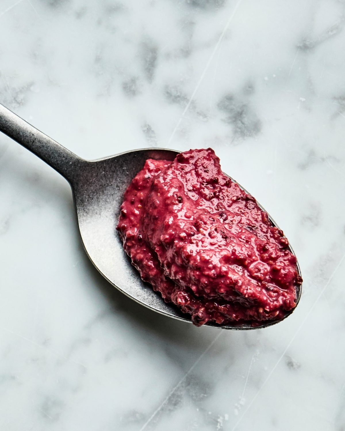 Tradicinės viso grūdo garstyčios 61 % (vanduo, garstyčių sėklos, actas, druska), garstyčios 26 % (garstyčių sėklos, vanduo, actas, druska, cukrus, konservantas: natrio bisulfitas), Bordo vynas 10 %, burokėlių milteliai, Madagaskaro pipirai.